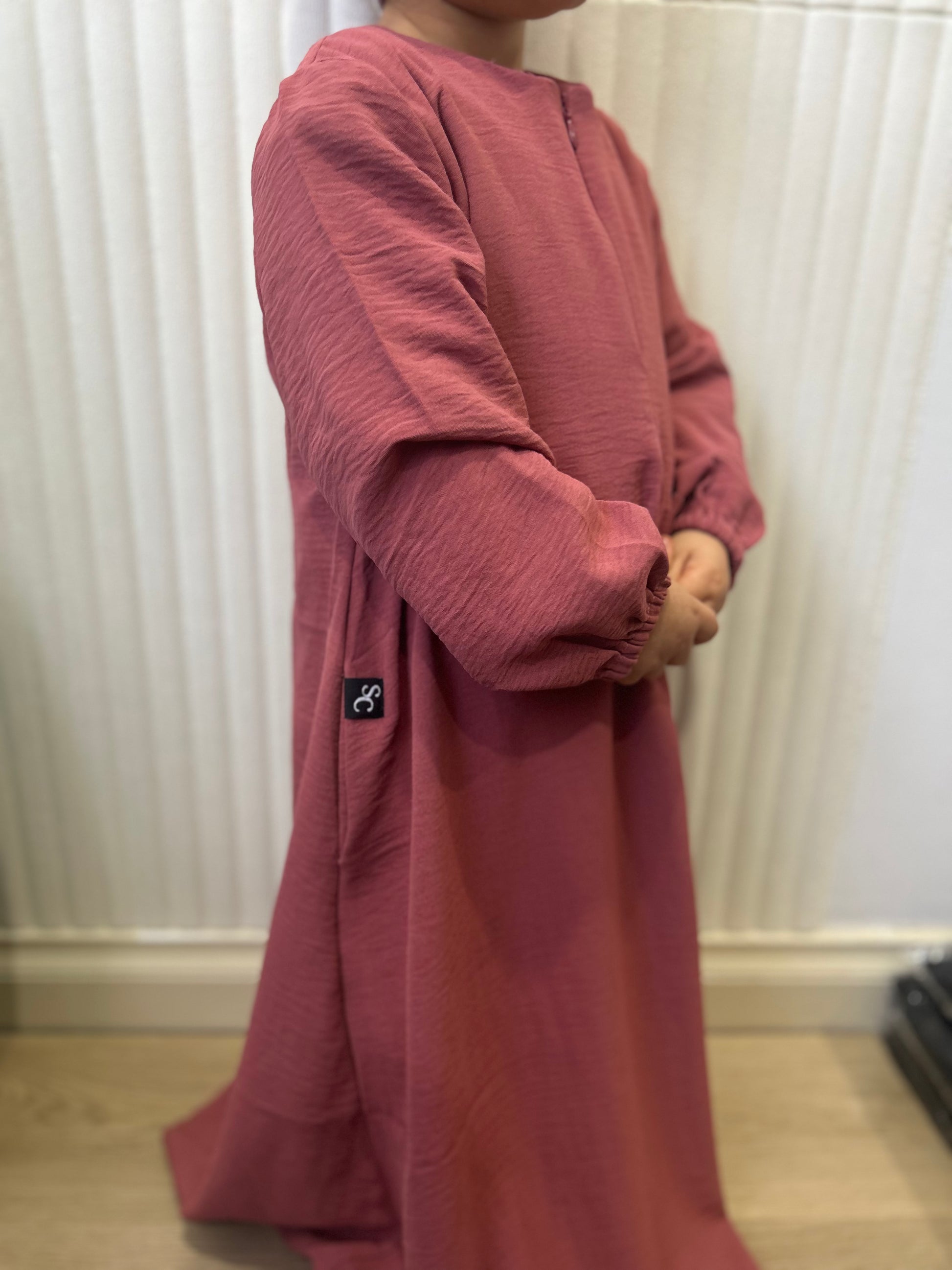 This kids abaya and khimar set is available for three different age groups 2-4 years, 5-7 years and 8-10 years. These sets are made from soft, lightweight Crinkle fabric for a comfortable and stylish look. It features our Shariah Collections Ripple abaya for minis with cuffed bubble sleeves for extra comfort. The front zip makes dressing easier for children of all ages and the two side pockets add a practical touch. The khimar is a comfortable slip-on style designed at the perfect length for each age group, shorter around the hands to give more ease of movement for our active children.