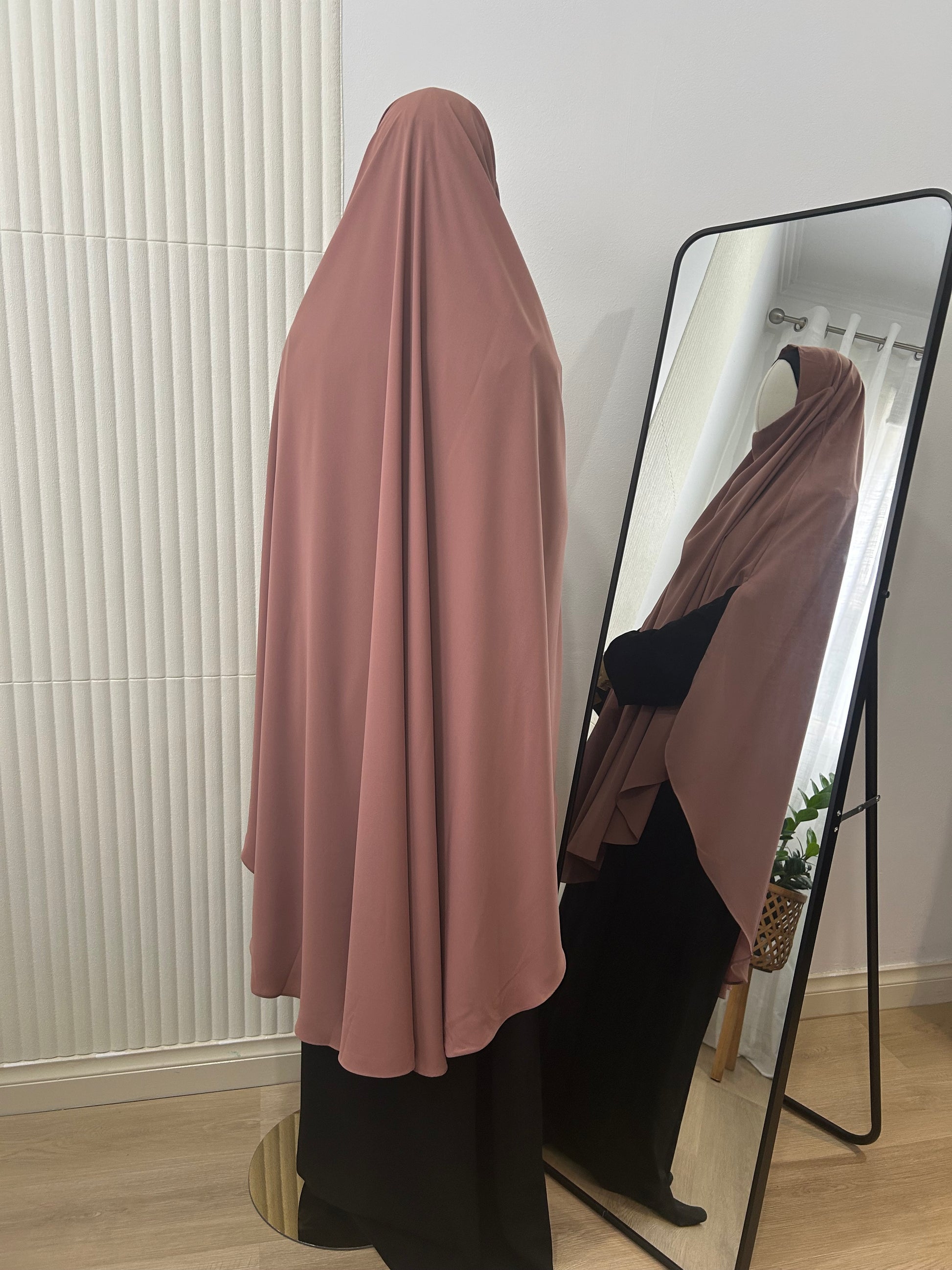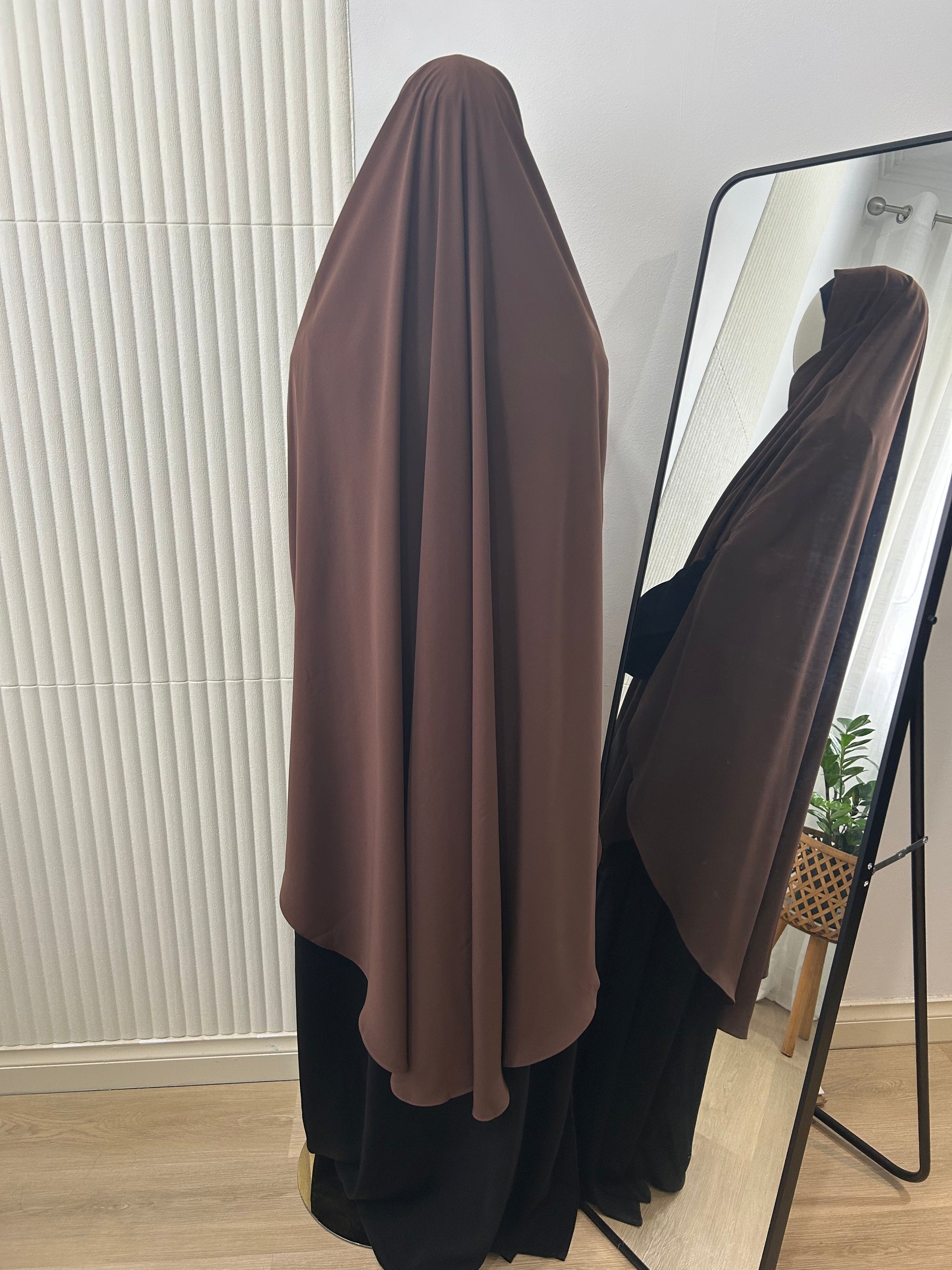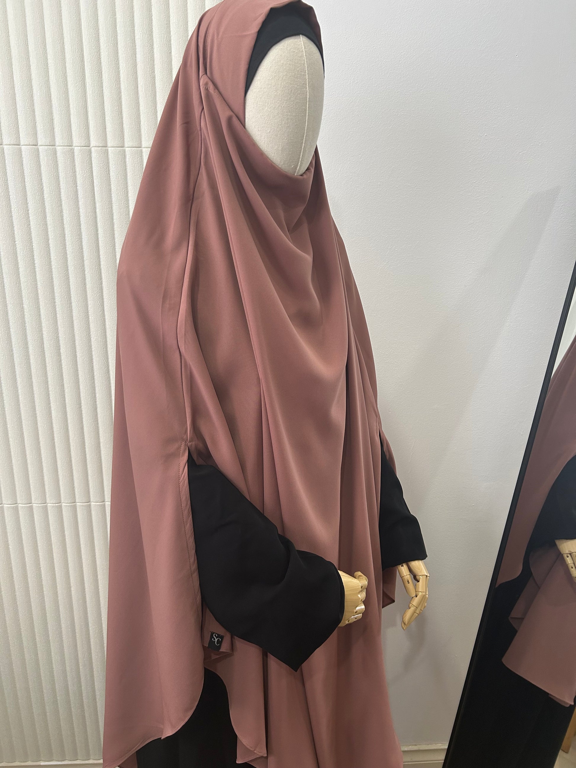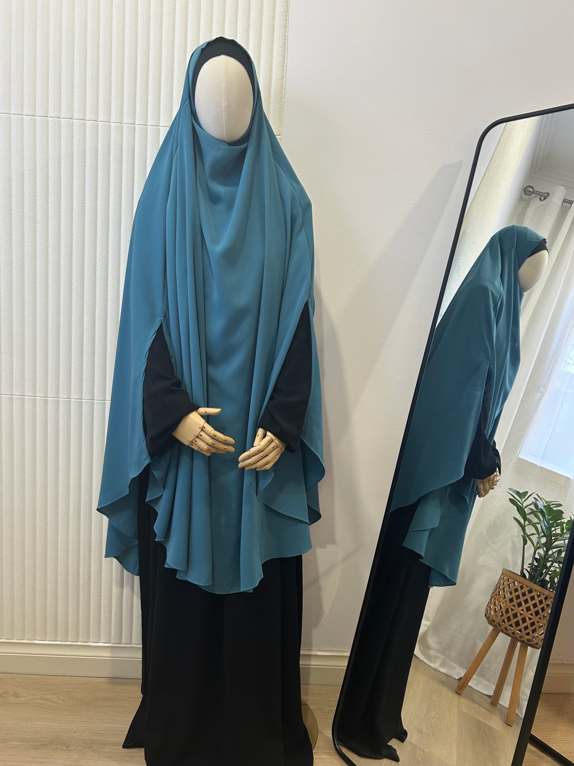 This one-piece khimar is both unique and stylish. Made from lightweight, breathable Woolpeach fabric, it offers comfort and convenience. It features Shariah Collections innovative, discreet neckpiece for complete coverage, ensuring the neck is concealed for peace of mind. The longer back and slightly shorter front provide a practical and flattering fit, while the side splits ensure freedom of movement. It doubles up as a functional and also sophisticated piece, showcasing the details of your sleeved abayas on those special occasions. Try pairing it with our Raindrop abaya for the perfect look!